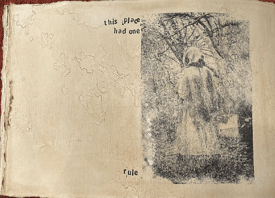 The final book, titled ‘Don’t Get Lost,‘ draws inspiration from my personal upbringing and the tales told to me for safety. Raised in a secluded, densely wooded environment often described as the “middle of absolute nowhere”, I remembered the importance to remain on designated paths and avoid getting lost. Drawing upon aspects from the classic tale of ‘Little Red Riding Hood,’ I crafted characters embodying this such as ‘the girl’ and ‘the beast,’ thereby constructing a narrative reflective of my own experiences.